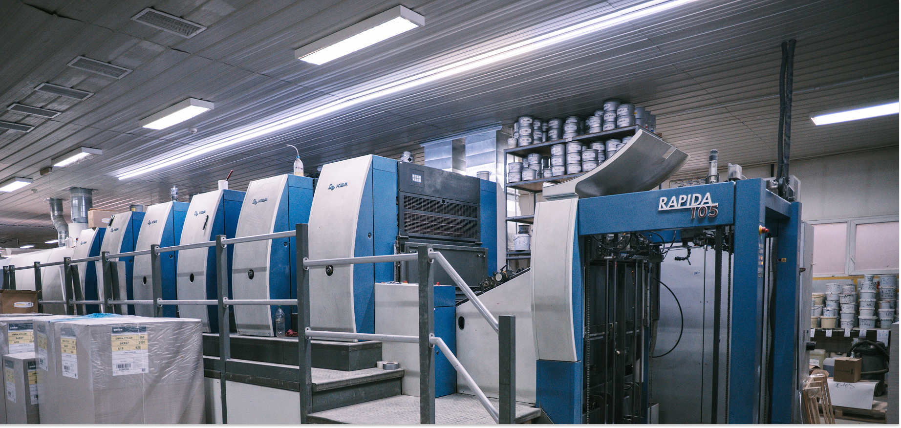 Stampa je bazirana na Offset KBA masinama u 2 velicine B1 I B2, time mozemo da ispunimo sve zahteve za stampu Stanc imamo 2 ravne stance I 4 cilindricne masine, da bi postigli potrebne kapacitete nasim offset masina. Da bi na kraju kutija bila zalepljena koristimo 4 masine za lepljenje izmedju 1 I 6 tacaka.